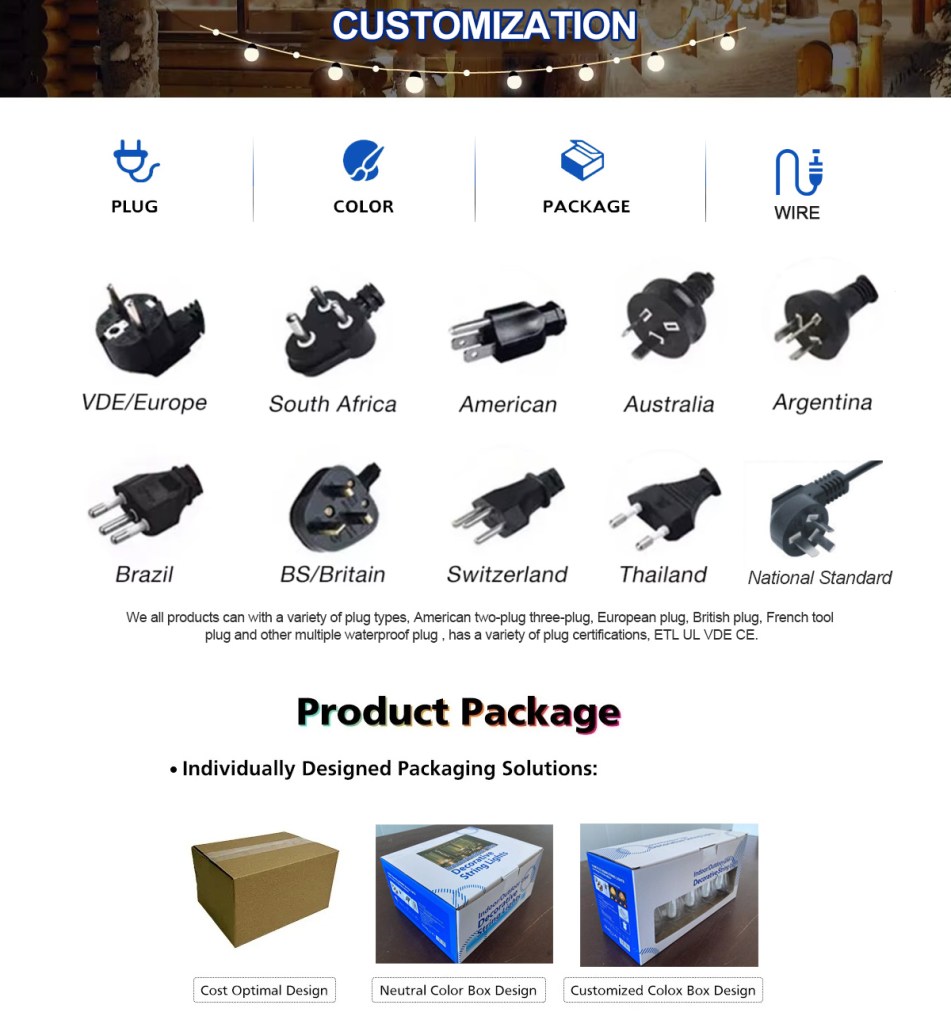 we mainly produces various light string , G30 G40 G50、S14 E26 light string , led mini light strands ; C7 C9 led bulbs, power cord , extension cord , Christmas light accessories (clips , plugs , light stakes ) etc.