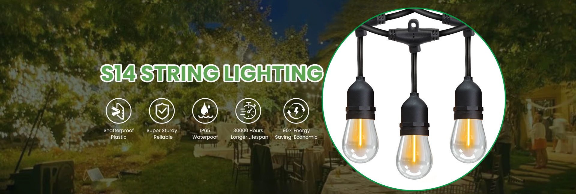 Colored string lights made by fairly new LED technology but retro Edison light bulb design.Weatherproof – Waterproof IP65, Windproof and Shock Proof.